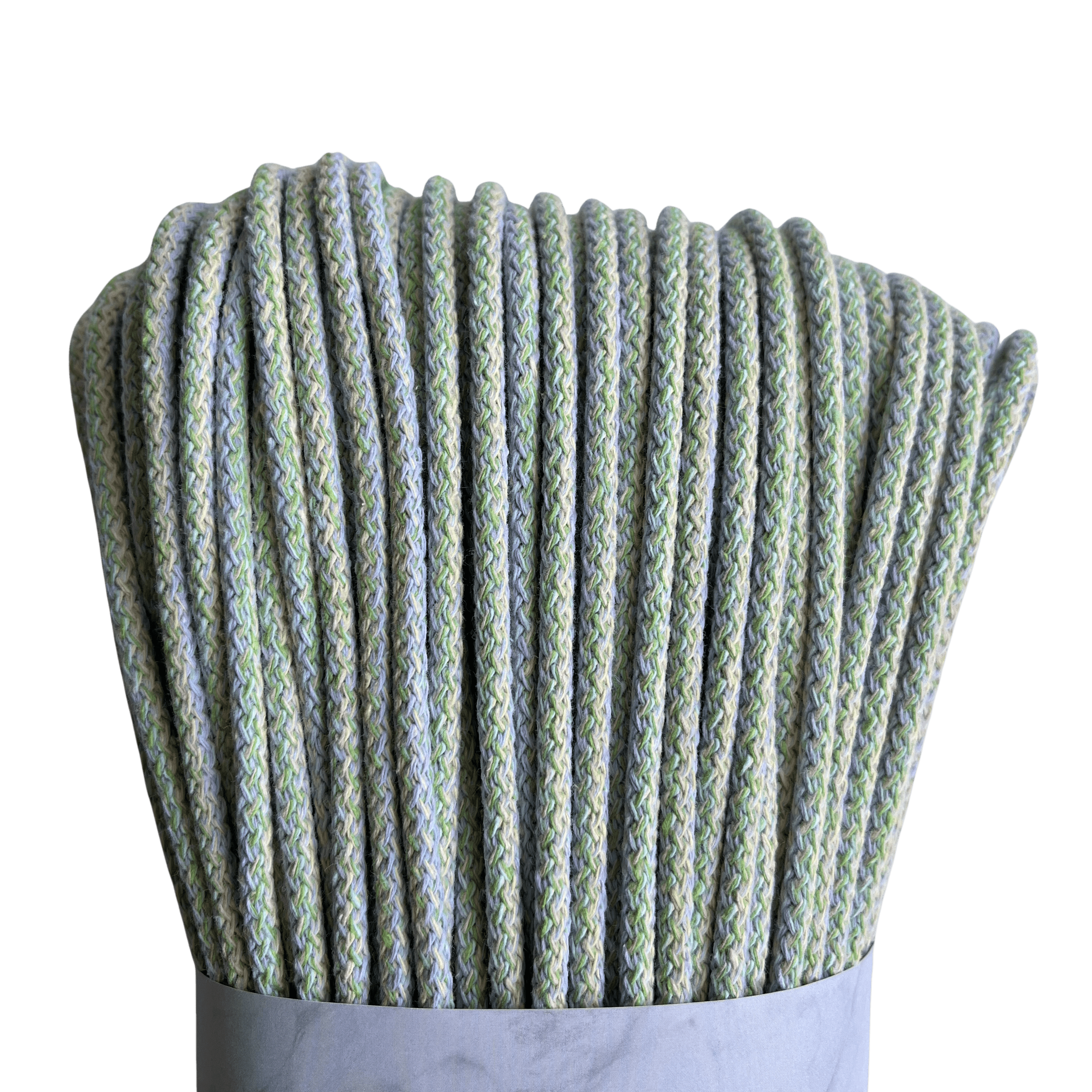 Przedstawiamy sznurek do szycia na maszynie o średnicy 5 mm, stworzony z wysokiej jakości bawełny pochodzącej z recyklingu. Sznurek posiada poliestrowy rdzeń. Jest bardzo sztywny, co możesz zobaczyć na drugim zdjęciu w galerii. Dzięki temu przy jego pomocy uszyjesz kosze z niezapadającymi się ścianami oraz piękne torby, które bez problemu trzymają swoją formę.