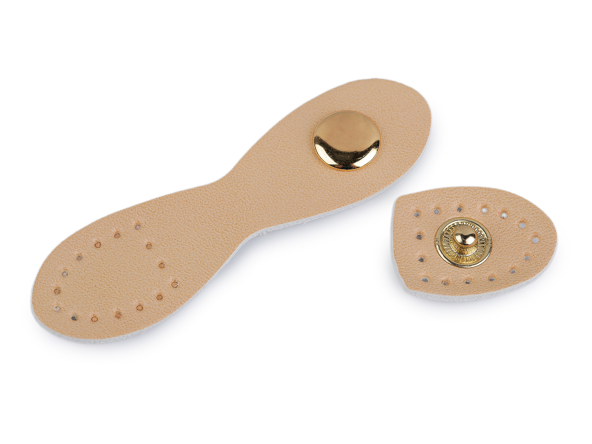 Eleganckie, dwuczęściowe zapięcie z wysokiej jakości ekoskóry, zapinane na solidny metalowy zatrzask w kolorze złotym. Przeznaczone do naszycia na torebki, portfele, torby.